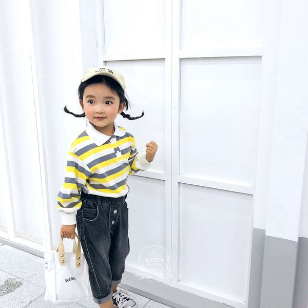 条纹永远是经典不败的搭配,看维尼叮当这一件上衣,黄白相应的条纹高级感很强,白色配上黄色醒目亮眼,简约而不简单,大方时尚。加上一条牛仔萝卜裤简直就是潮童必选穿搭。