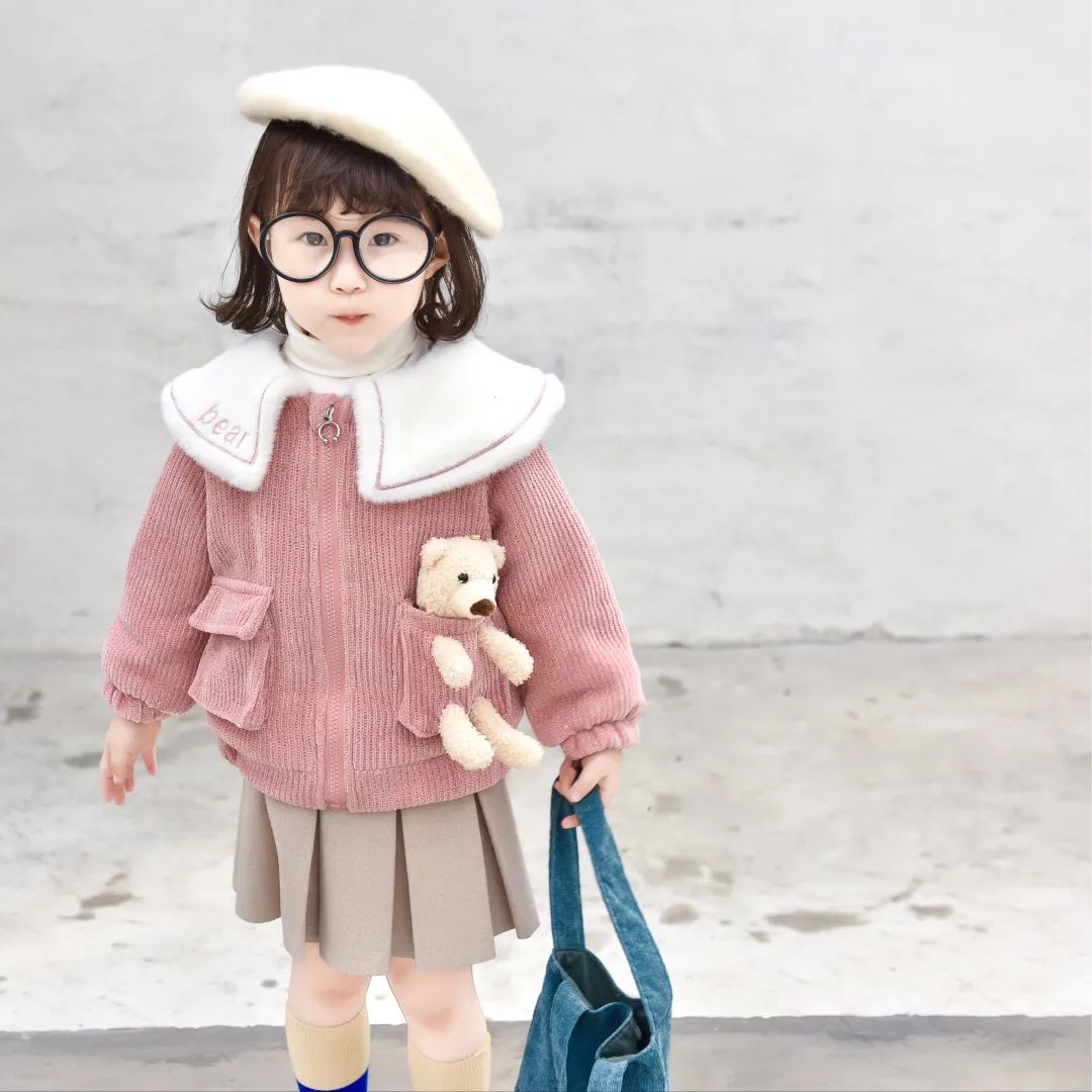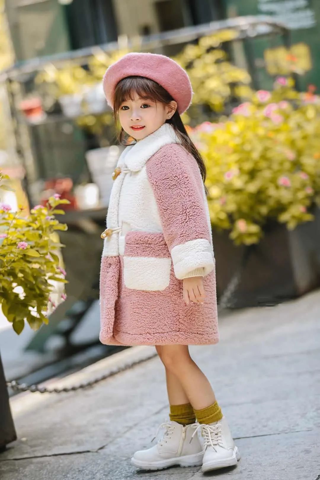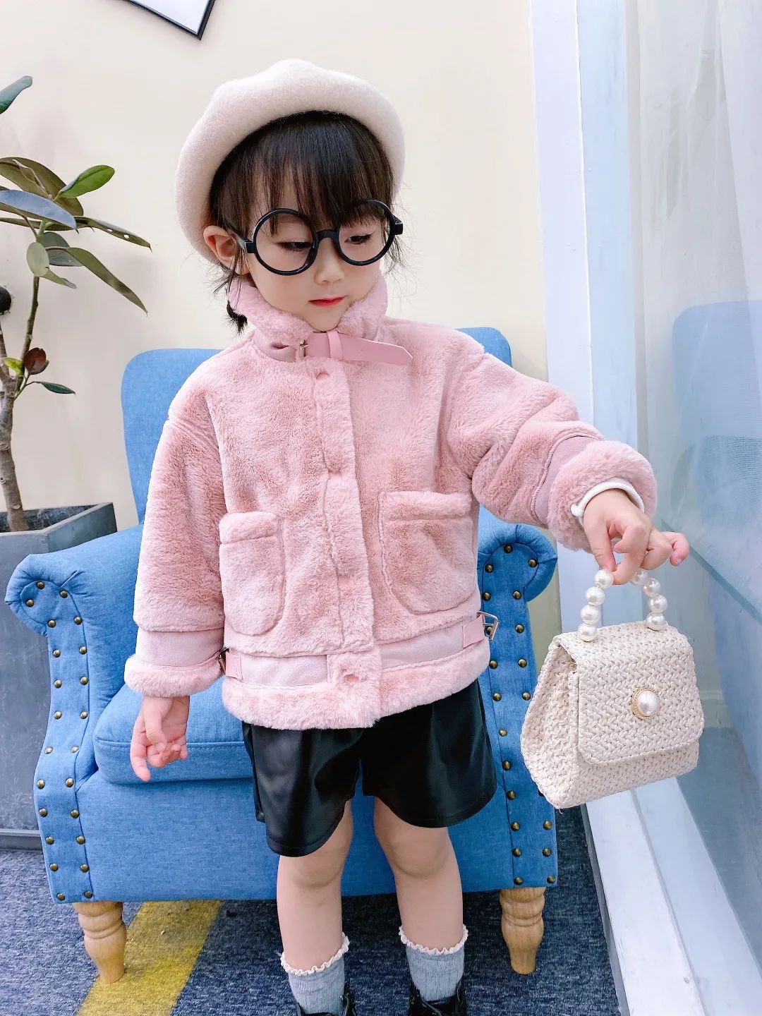 粉色短款羊羔毛外套+淡粉色贝雷帽+黑色皮短裤+灰色花边短筒袜