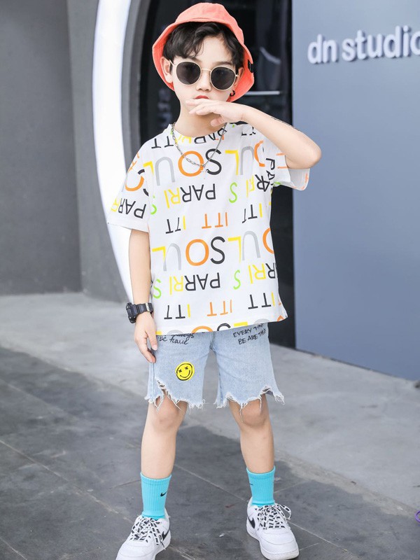 T恤是男孩夏季的经典单品,单纯的白色T恤难免显得太单调,那么加上多种色调的时尚英文字母印花设计,顿时时尚感十足,牛仔裤的裤边不规则设计,再加上趣味十足的小笑脸设计,这样的穿搭活泼可爱又时尚。