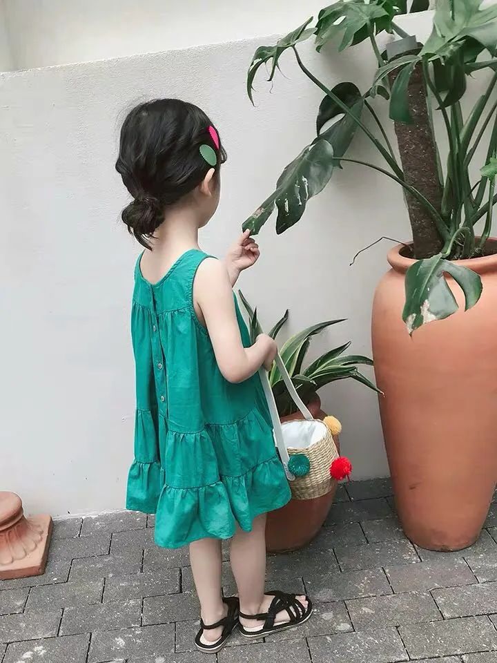 女宝选择自带降温系统的绿色连衣裙,清凉舒适,纯色设计,优雅的裙摆设计,勾勒出下摆精致浪漫,衬托出整体连衣裙更具高级感。