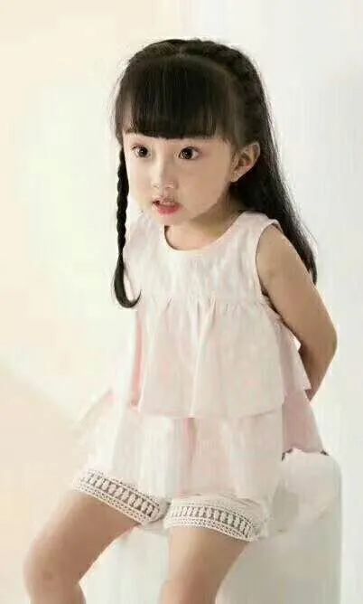 女宝选择粉色的无袖上衣带来轻松惬意的优雅感,裤子带有独特的蕾丝边设计,随着手臂摆动飘扬,可爱极了。
