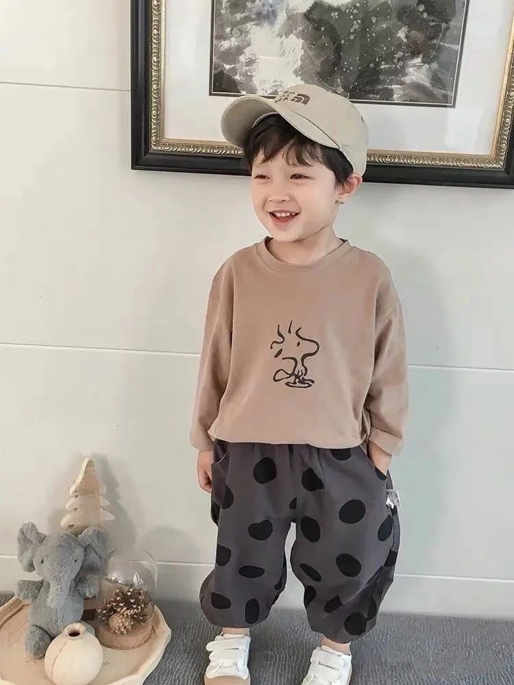 男宝首推可爱的史努比打底衫,下搭复古的波点休闲裤,宽松舒适的版型,精致的装饰更有层次感。