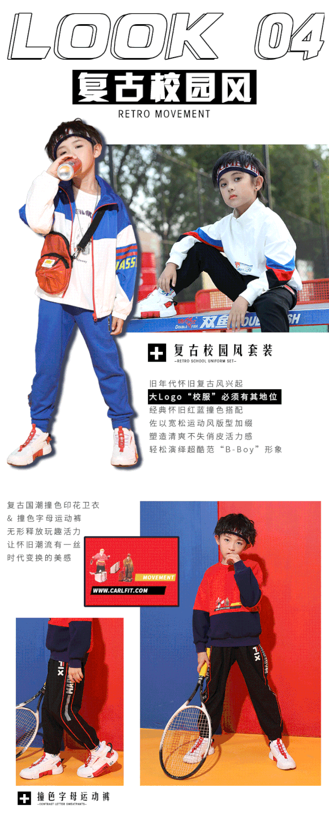 点亮玩味复古潮,散发动感的张扬气质,即使穿梭在校园运动场中,依旧玩酷有范,复古运动风回潮。哪一款怀旧穿搭更得你心,欢迎留言与我们互动。CARLFIT卡儿菲特童装2020春装已上线,欢迎到店选购。