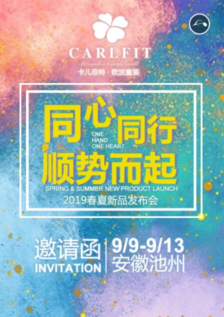 卡儿菲特·欧派童装【同心而行·顺势而起】2019春夏新品发布会将于2018年9月9日至13日在安徽池州卡儿菲特产业园隆重举行,在此,卡儿菲特童装诚挚邀请众位家人们莅临出席!