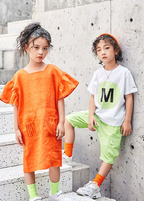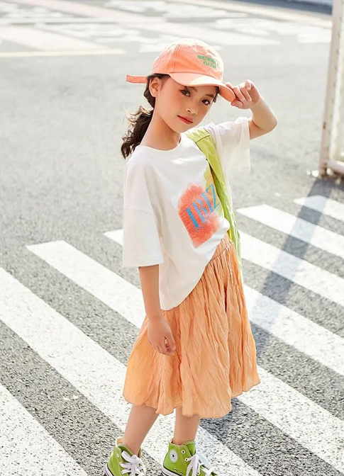 甜美时尚清新,是小公主们崇尚的夏季穿搭,一件简约时尚的白色印花T恤,搭配橙色皱褶长摆裙,甜出蜜来,仿佛天空都明亮起来。