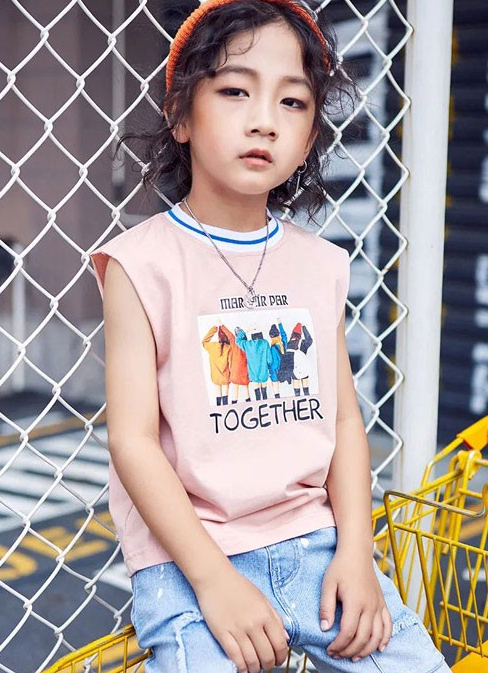 甜美小清范,带有童话色彩的动漫图案,小小的粉色印花背心,搭配水磨蓝牛仔酷,可盐可甜,可萌可温婉,小甜心范都是小女生最喜欢的一款。