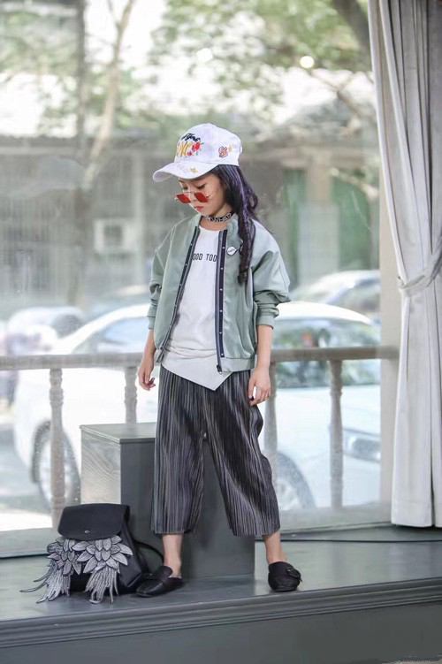 女孩子的潮酷范也很有型,今年超火的金属暗纹元素除了与裙子组合,与九分裤也很搭配,不规则白色内搭打造不羁感,搭配小嗨皮童装的灰绿色外套,有范又出众,时髦值不言而喻。