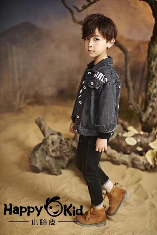 牛仔外套的潮范没有哪个男孩子能拒绝,板整有型的黑色牛仔衣搭配上深黑长裤与马丁靴,时尚与酷帅融为一体。白色字母图案与多扣设计再添时尚感,让宝贝做个“酷小孩”。