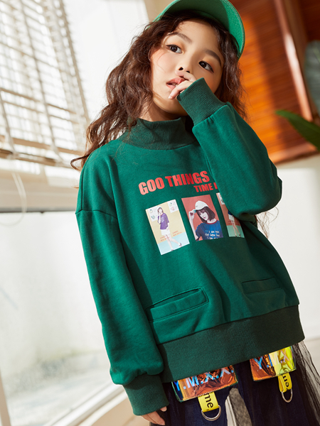 深绿色印花棉毛衫,采用螺纹领口、袖口及下摆设计,印上自己喜欢的小明星,作为自己的榜样,好好鼓励自己,搭配的宝蓝色印花牛仔裤,点缀精美图案,反映出多姿多彩的童年时尚生活。