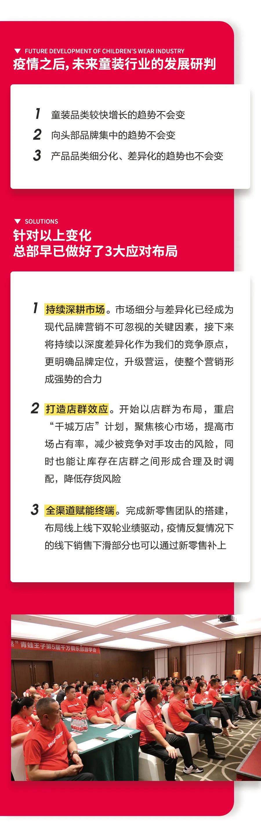 未来,青蛙王子也将与各位伙伴一起砥砺前行,坚持鞋服行业,不忘初心,于危机中看到转机,不负这大好时机;不负众期望; 成功抢滩我国童装市场,让我们携手共赢! 青蛙王子童装加盟,欢迎留言垂询。