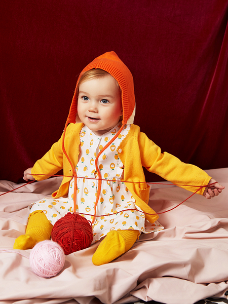 秋天不可少的明黄色针织外套,和秋天的季节很受搭配,搭配可爱的连衣裙和可爱的绑带毛线帽,萌萌的甜美范,稚气孩童,可爱又个性。